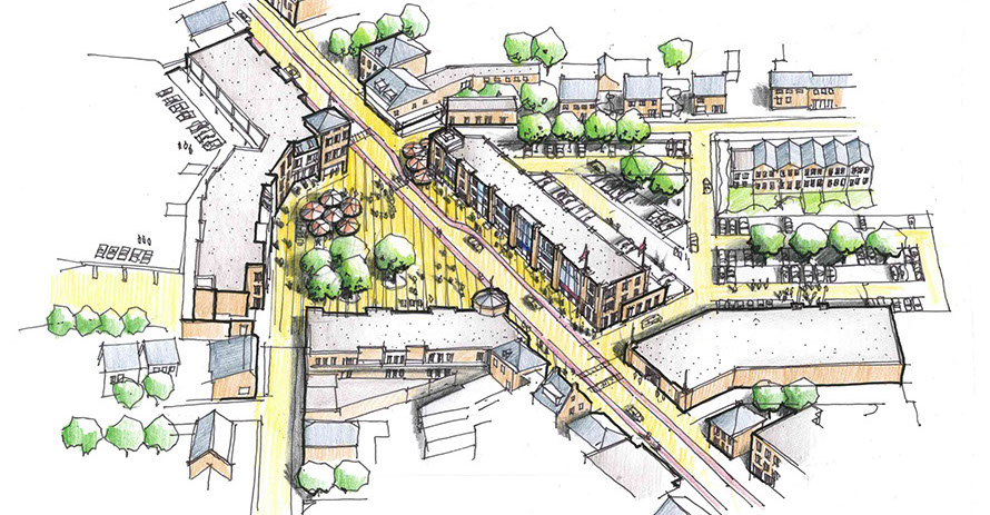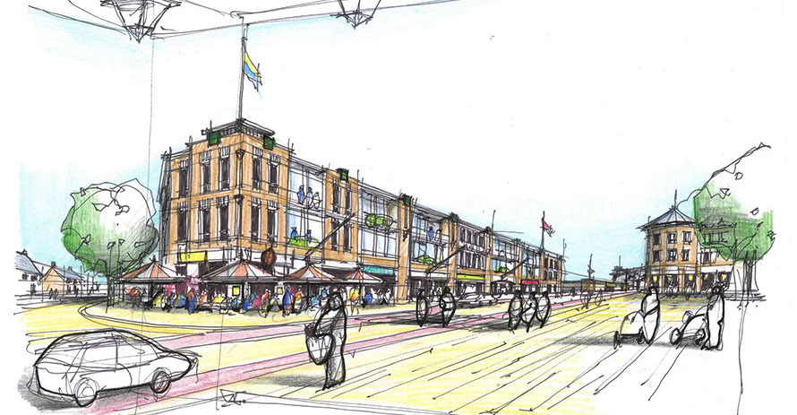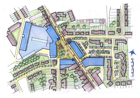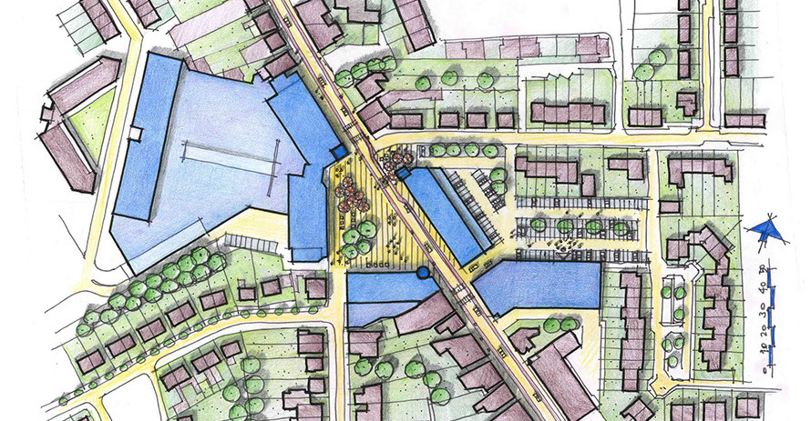 Rijen, studie voor 2.800 m2 commerciële ruimte en 14 appartementen.